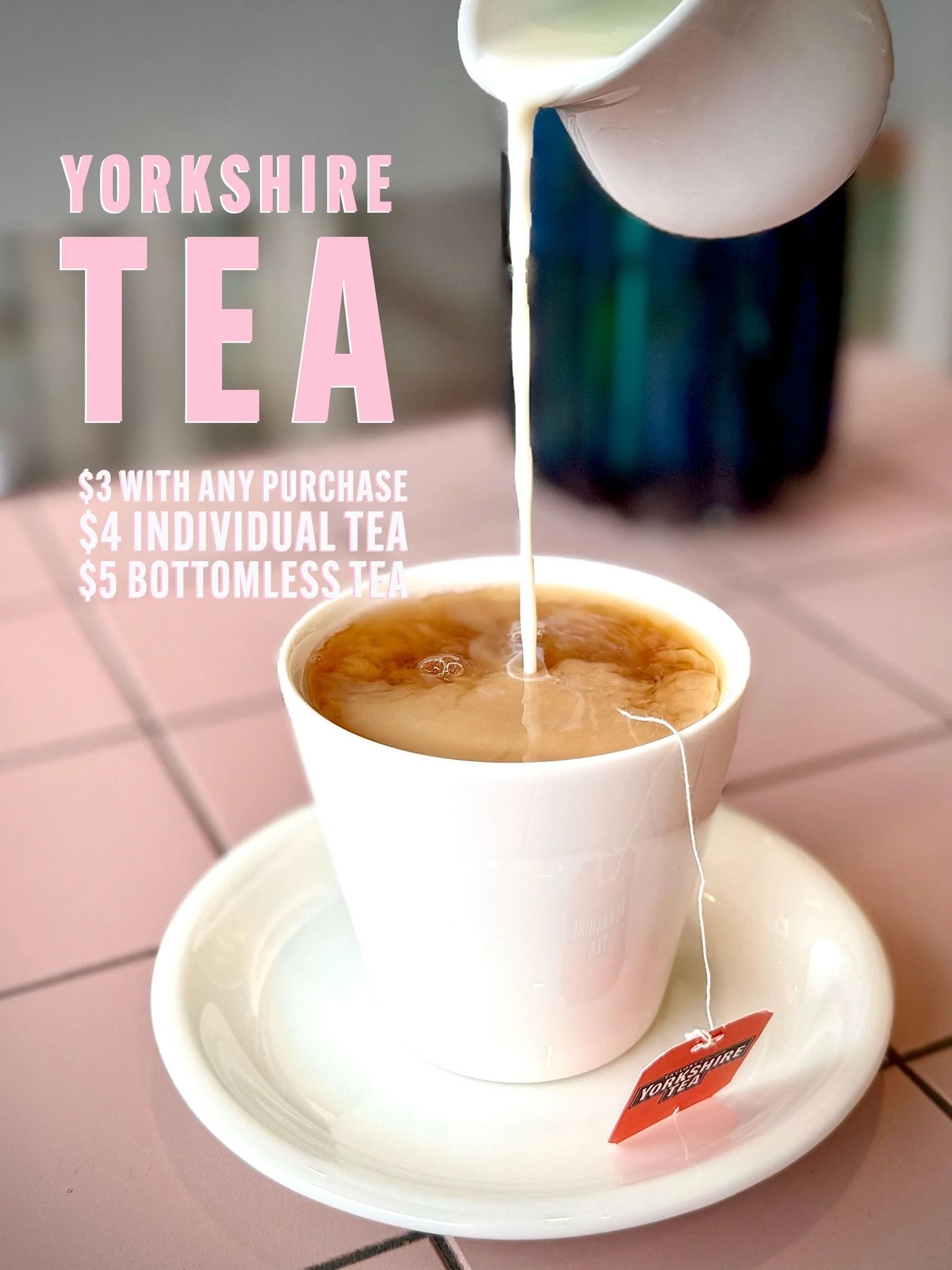 A cup of tea on a pink tiled table with a tea bag label hanging over the side and tea being poured into the cup from a teapot. Text on the image promotes Yorkshire Tea with pricing details.