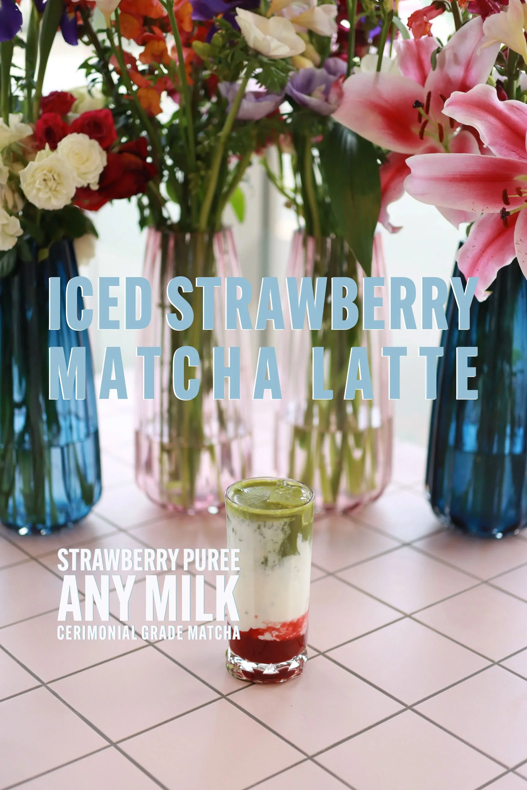 A tall glass of iced strawberry matcha latte with layered red, white, and green colors on a tiled table, with a background of colorful flowers in vases.