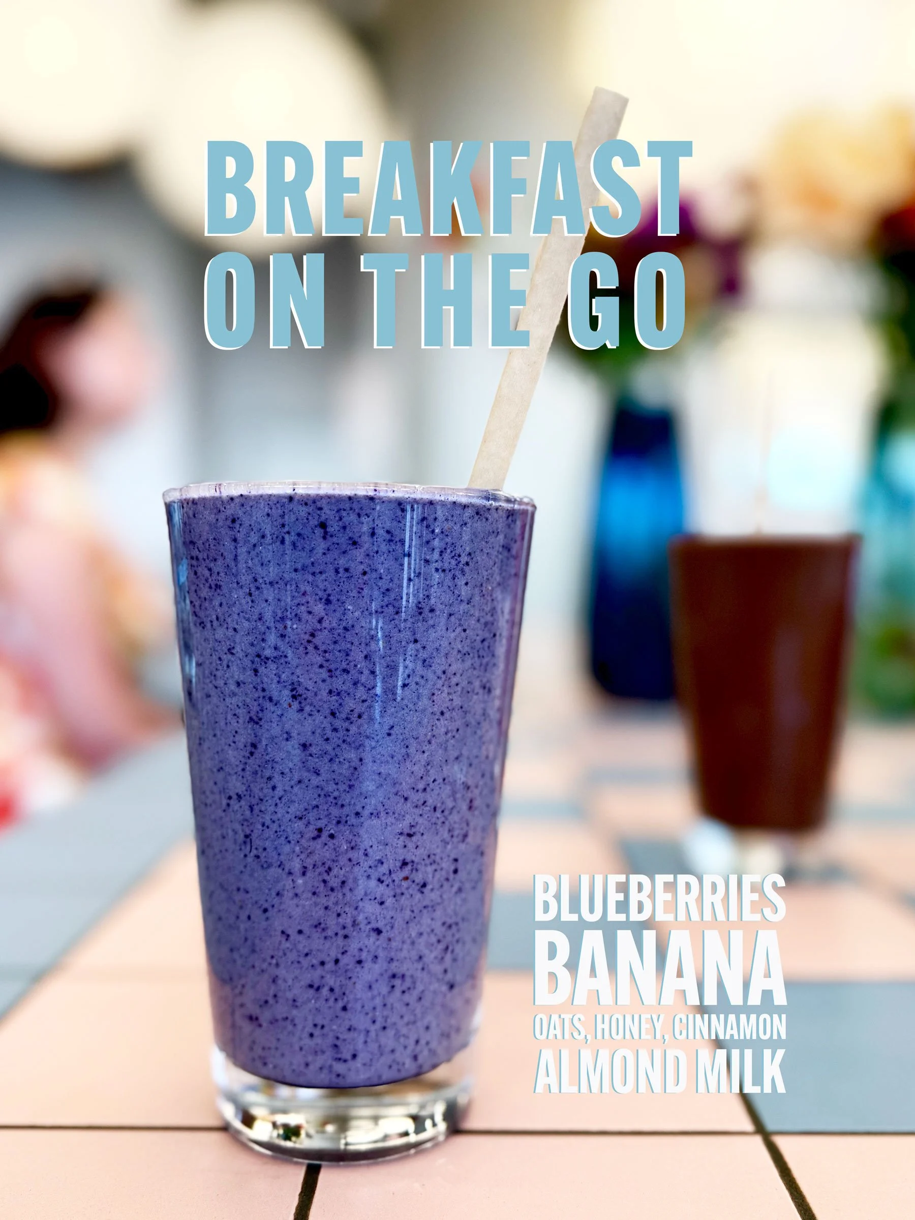 A tall glass filled with a purple blueberry banana smoothie, with a wooden spoon sticking out, on a tiled table with blurred background of other glasses and flowers.