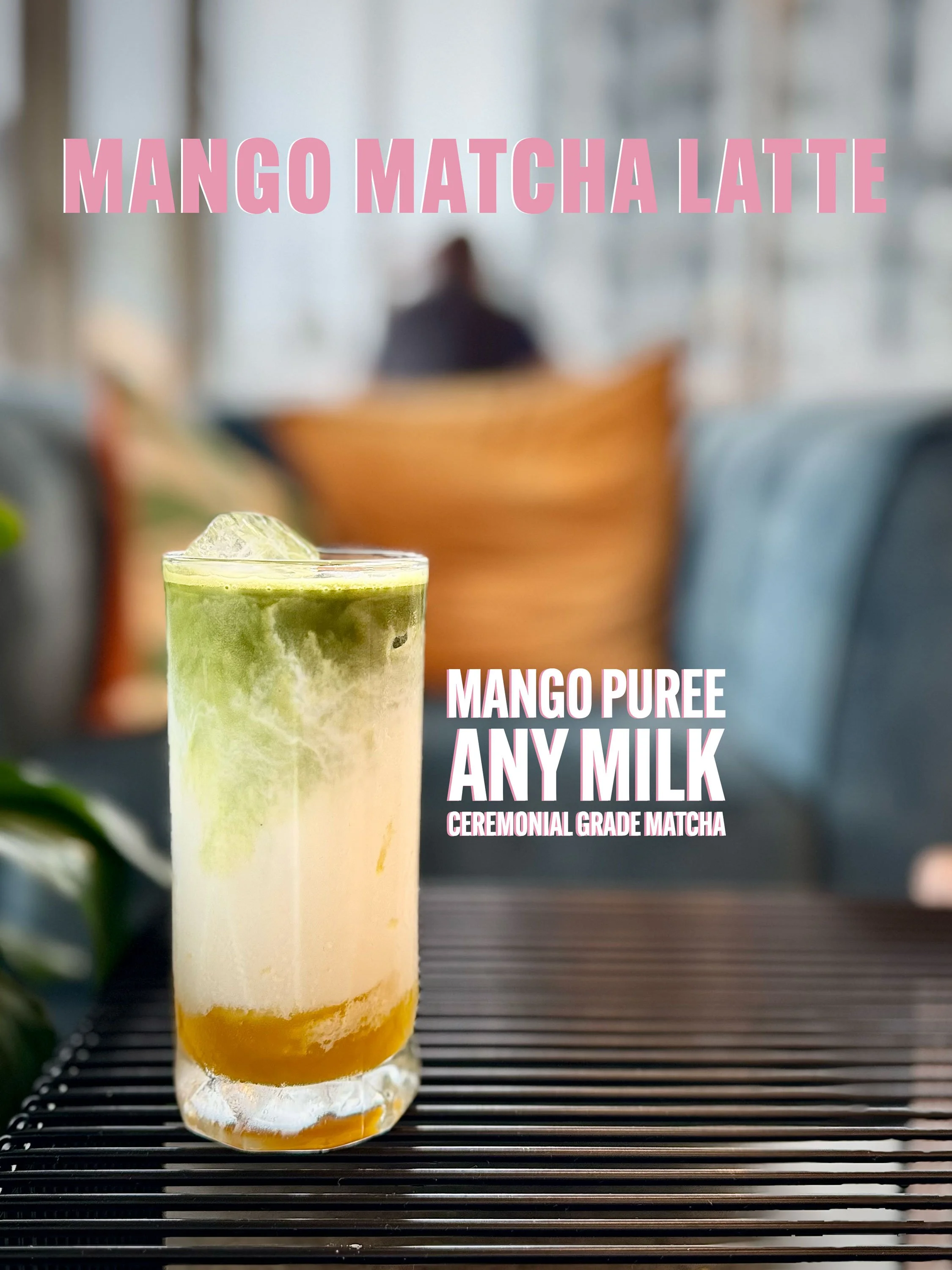A tall glass of layered iced Earl Grey matcha topped with ice, with text overlay advertising the drink's ingredients including Grade Matcha, any milk, and Earl Grey syrup.