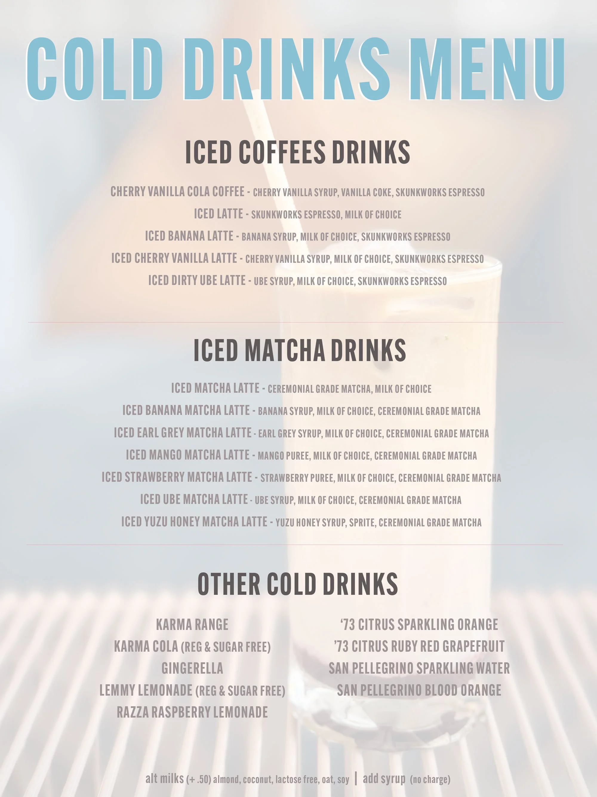 A menu for cold drinks including iced coffee, iced matcha, and other cold beverages. It lists different flavored iced coffees and matcha drinks with ingredients, and other cold drinks like soda and sparkling water.
