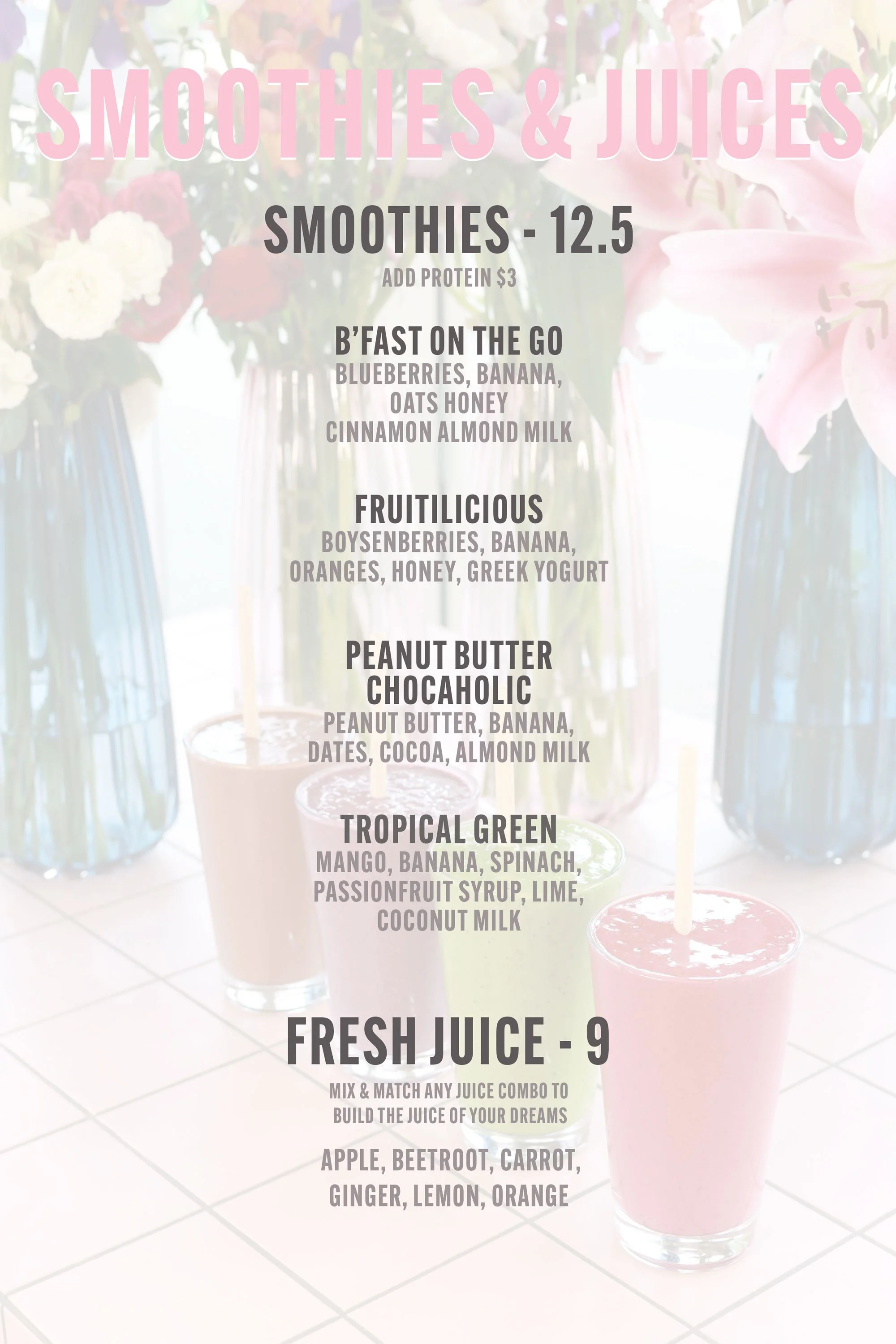 Menu of smoothies and juices with listed flavors and prices against a background of flowers in vases.