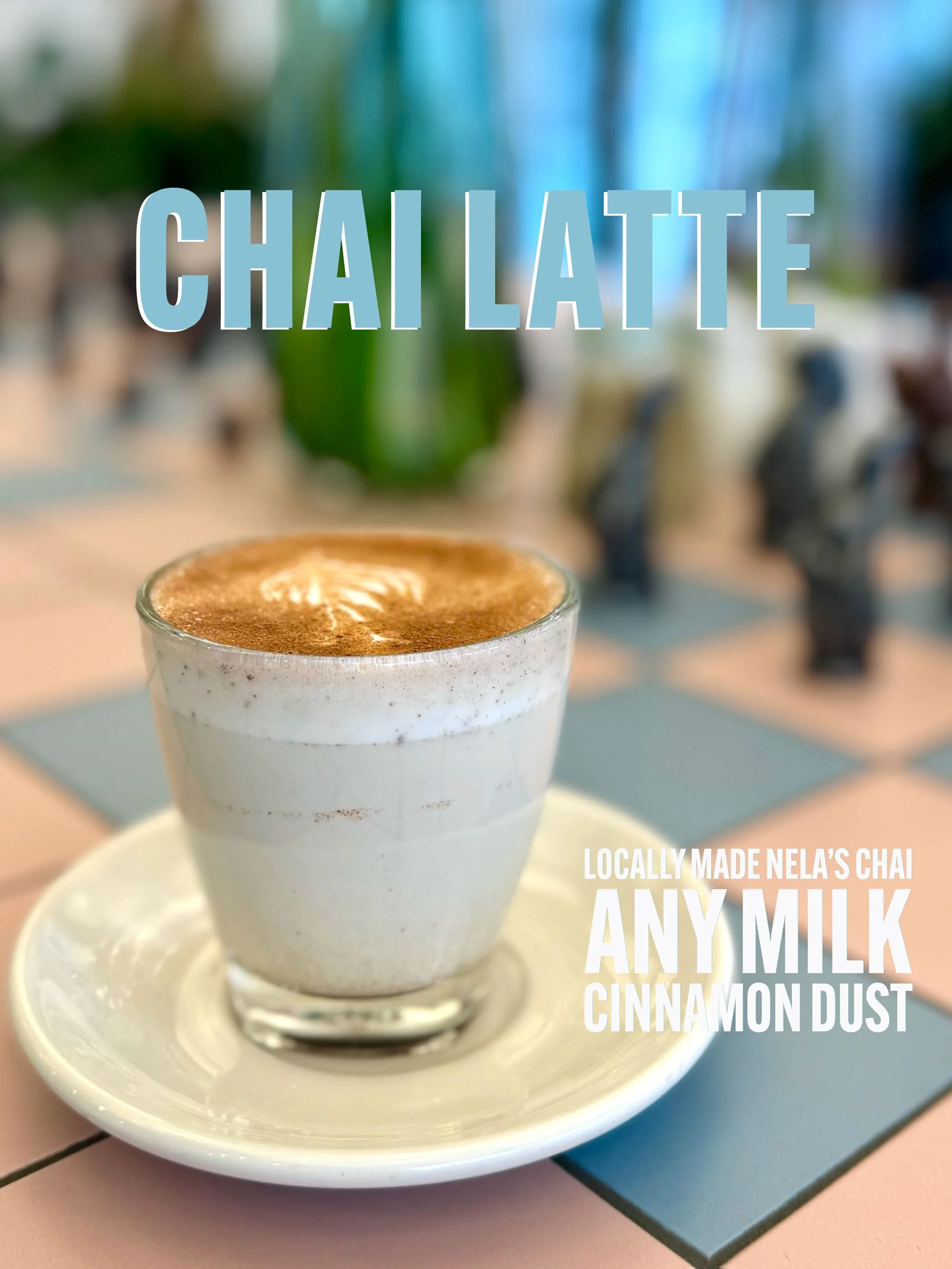 A glass of chai latte with cinnamon dust on top, placed on a white saucer on a pink table. Background shows out-of-focus chairs and a green plant.
