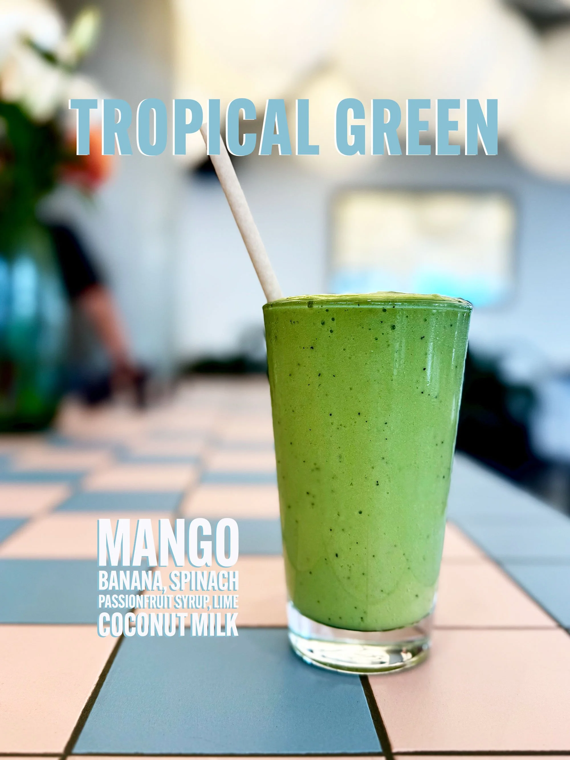 A tall glass of green smoothie on a tiled surface, with text overlay describing ingredients including mango, banana, spinach, passion fruit syrup, lime, and coconut milk.