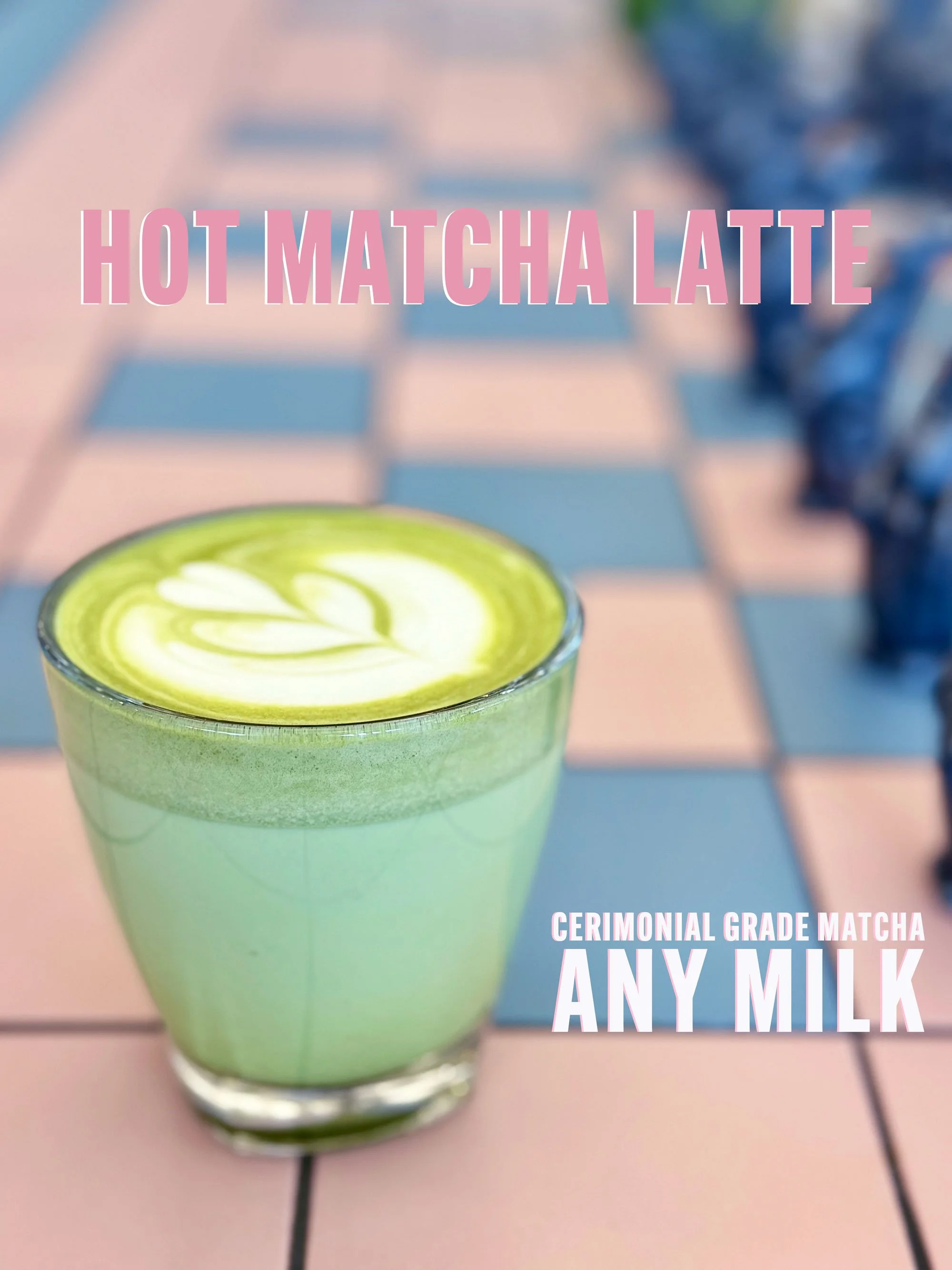A glass of hot matcha latte with latte art on top, placed on a tiled surface