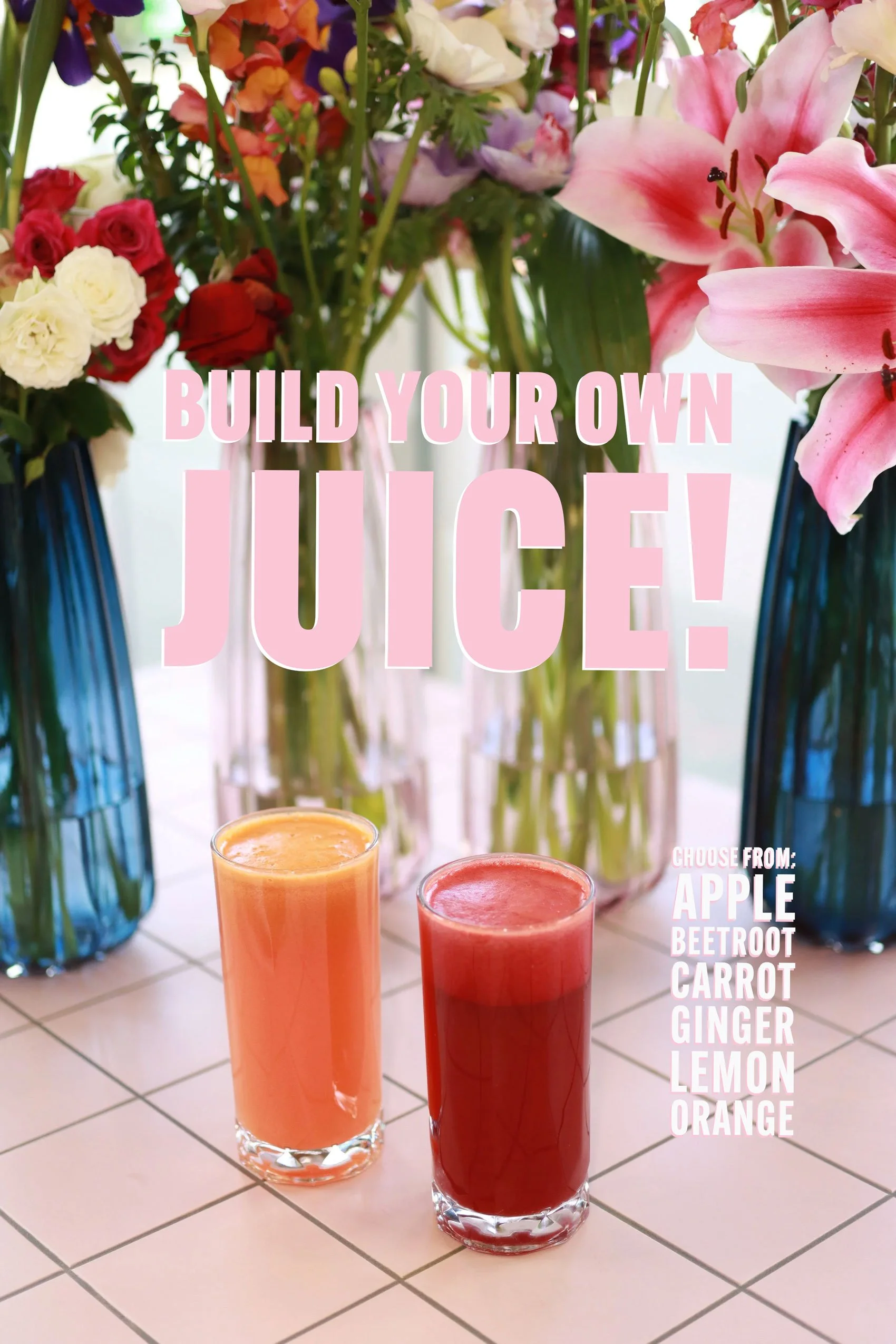 Two glasses of juice, one orange and one red, placed on a tiled surface in front of a backdrop of colorful flower vases. The image features pink text that reads "Build Your Own Juice!" and a list of fruit options including apple, beetroot, carrot, gi