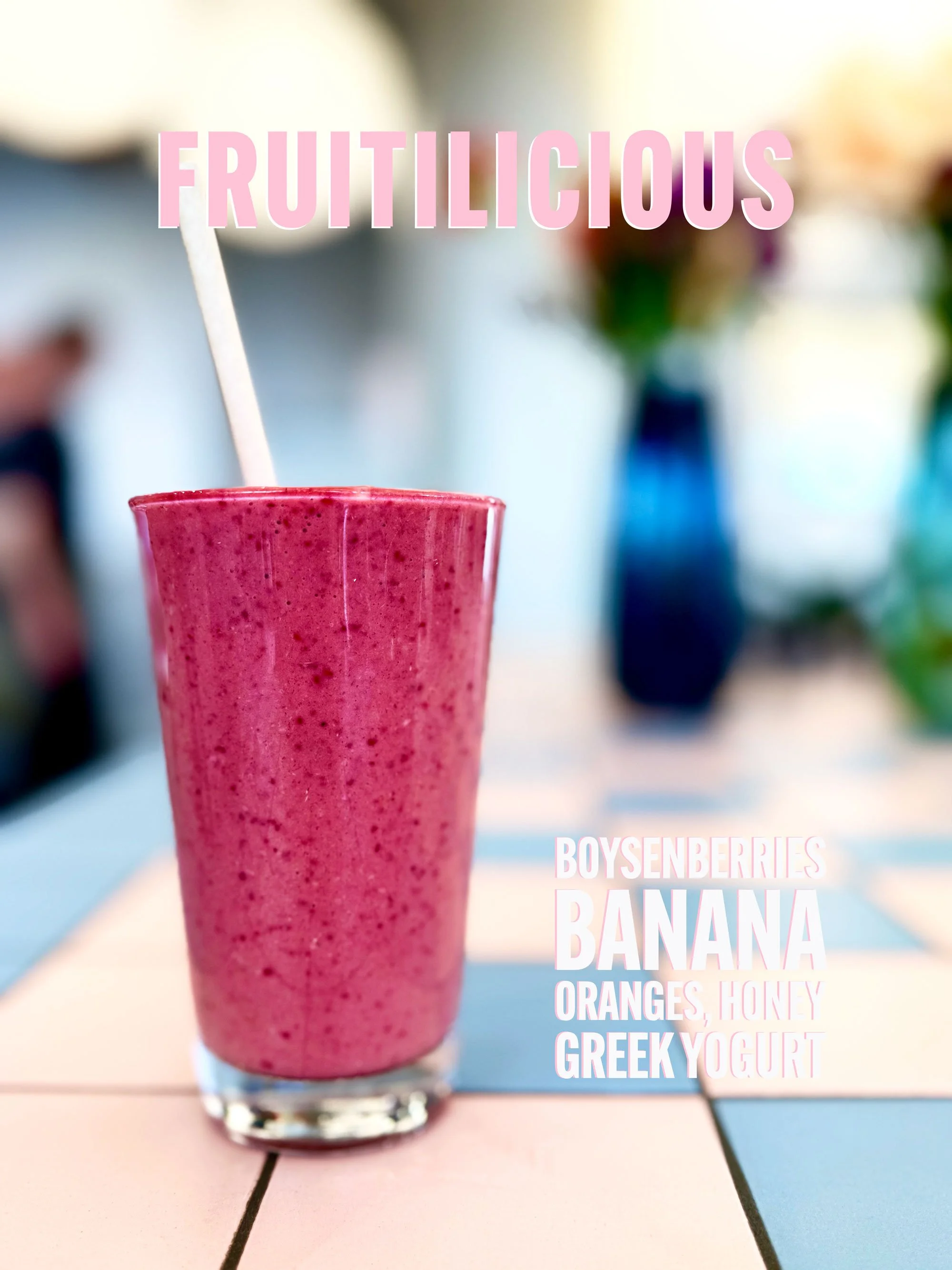 A pink smoothie in a clear glass with a straw, on a table with colorful tiles, with text describing ingredients including boysenberries, banana, oranges, honey, Greek yogurt, and the title "FRUITILICIOUS".