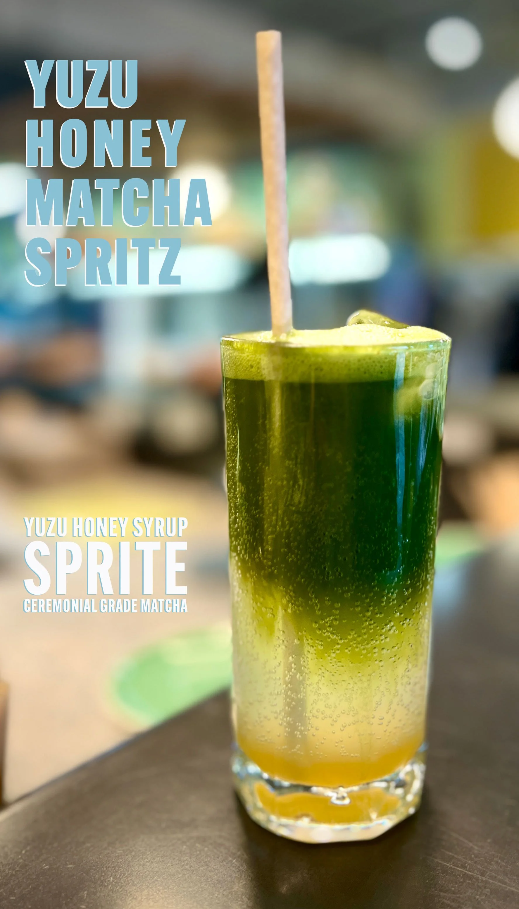 A tall glass filled with a layered Yuzu honey matcha Sprite drink, with a straw, on a dark surface, with blurred indoor background.