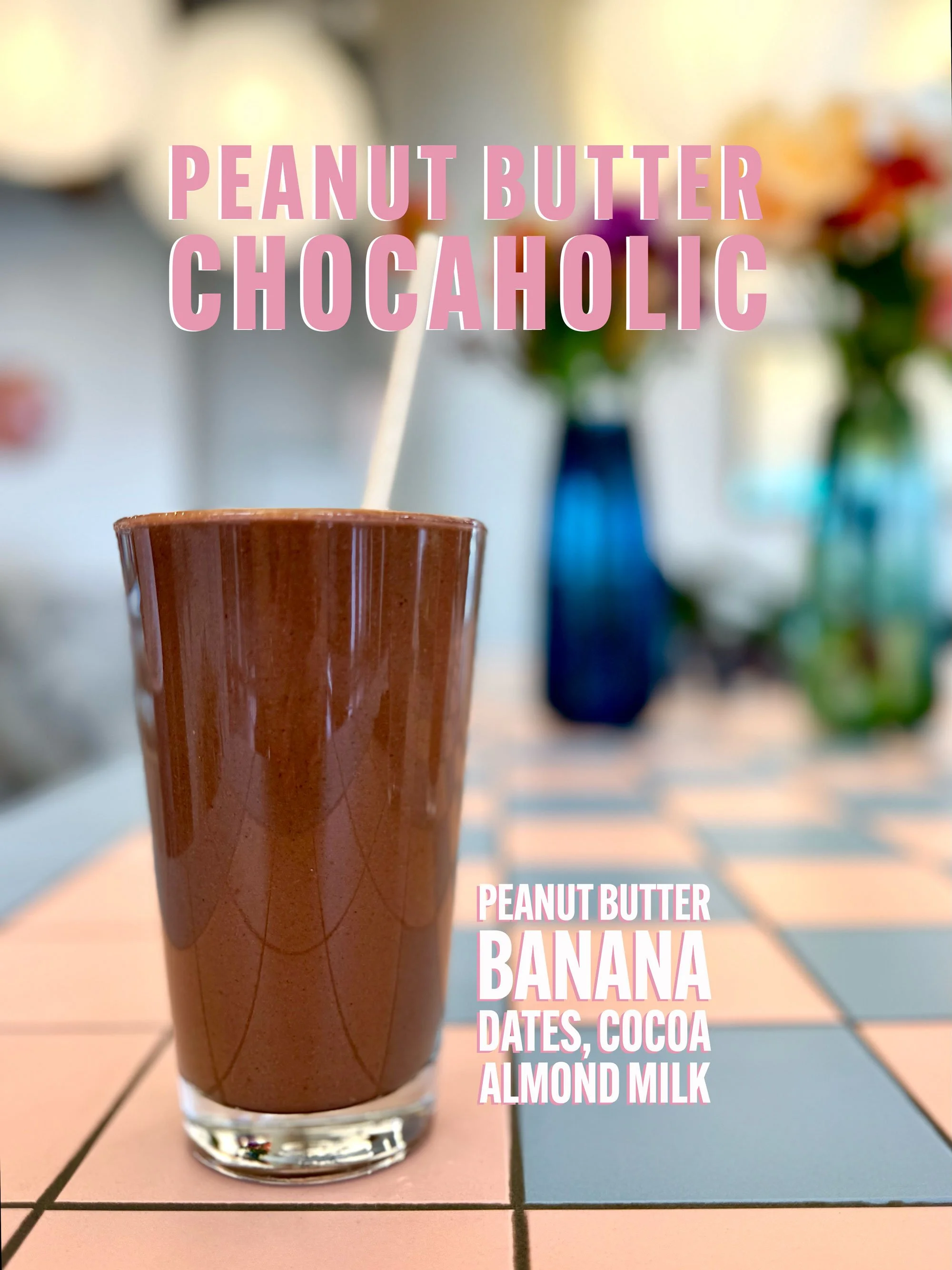 Chocolate milk in a clear glass with a straw, with text overlay describing a peanut butter chocolate smoothie with bananas, dates, cocoa, and almond milk.